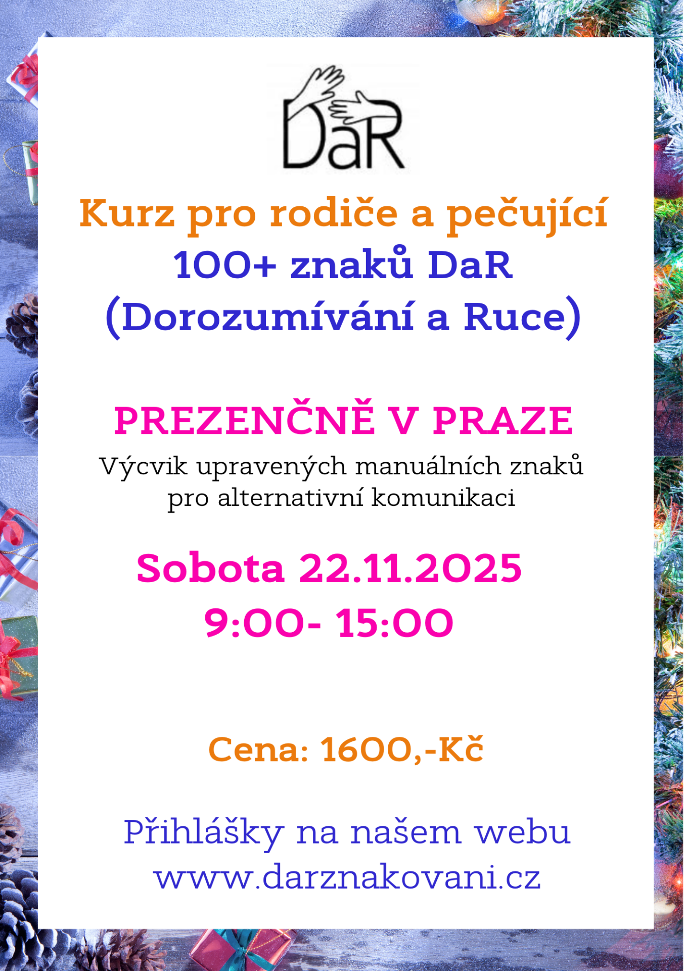 Prezenční kurz 100+ znaků DaR pro rodiče a pečující. V sobotu 22.11.2025 od 9:00 do 15:00 hodin. Přihlášky ZDE. Pořadatel: Mgr. Libuše Neville, spoluautorka a lektorka kurzů DaR, email: neville.libuse@gmail.com